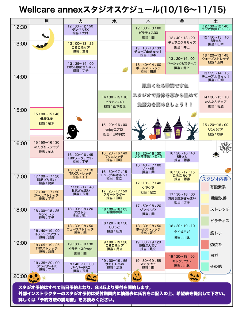 スタジオ 10月16日〜11月15日 スタジオスケジュール から staff - 10月 11, 2025 0 193 FacebookTwitterPinterestWhatsApp 10月16日〜11月15日のスタジオスケジュールが決定いたしました‼️ 長い長い夏が終わり、肌寒い季節になりましたね🍂 季節の変わり目で風邪など引かないよう🤧 スタジオで身体を芯から温めて免疫力を高めましょう🔥✨