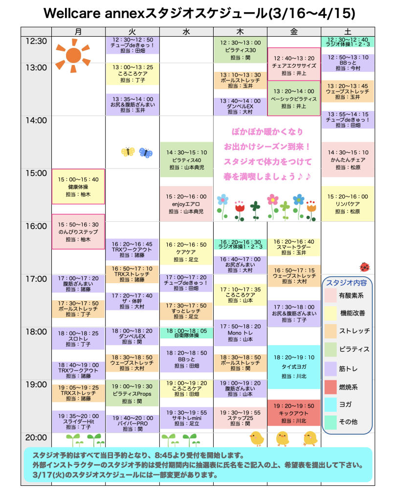 スタジオ 3月16日〜4月15日 スタジオスケジュール から staff - 3月 11, 2026 0 180 FacebookTwitterPinterestWhatsApp 3月16日〜4月15日のスタジオスケジュールが決定いたしました‼️ 寒暖差の激しい冬を乗り越え… ぽかぽか暖かくなり、お出かけシーズン到来です☺️ スタジオでしっかりと体力をつけて、春を満喫しましょう🌸✨